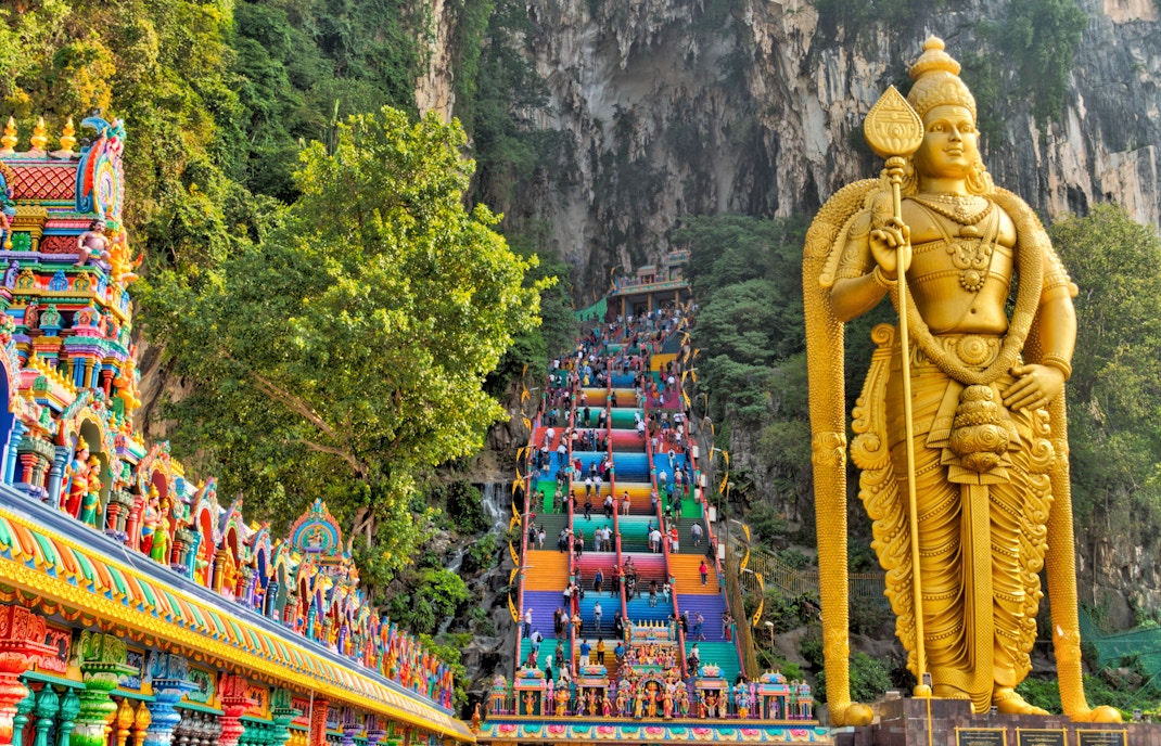 A primeira coisa que você notará é a grande escadaria que leva à Temple Cave. Você subirá 272 degraus pintados com cores vivas que formam uma das mais icônicas oportunidades de fotos na Malásia. Você verá pássaros coloridos, macacos brincalhões e os dramáticos penhascos de calcário que cercam a área.